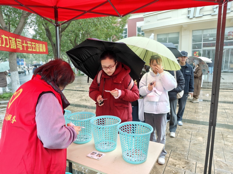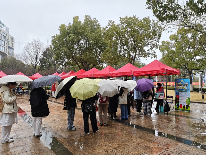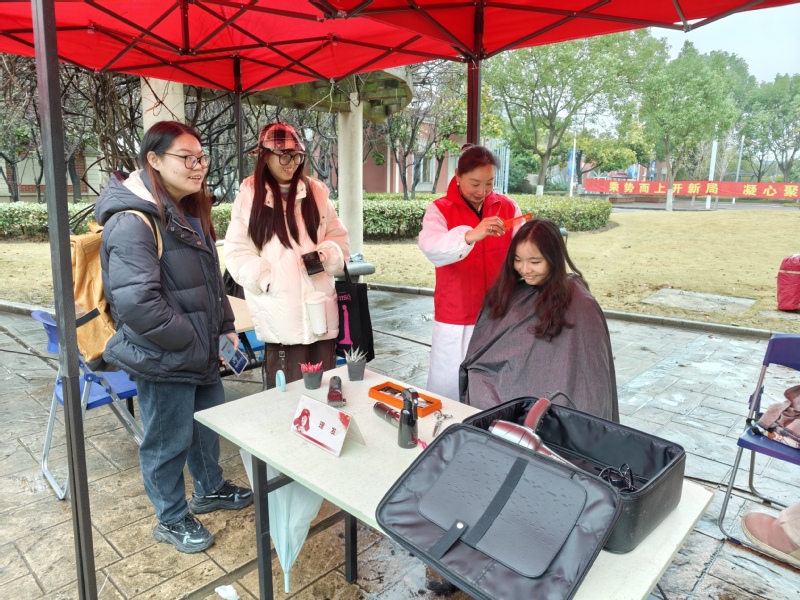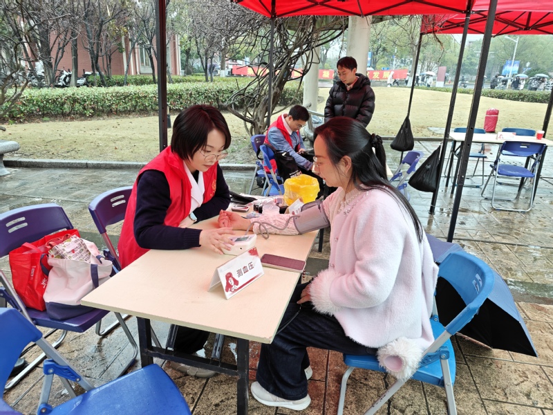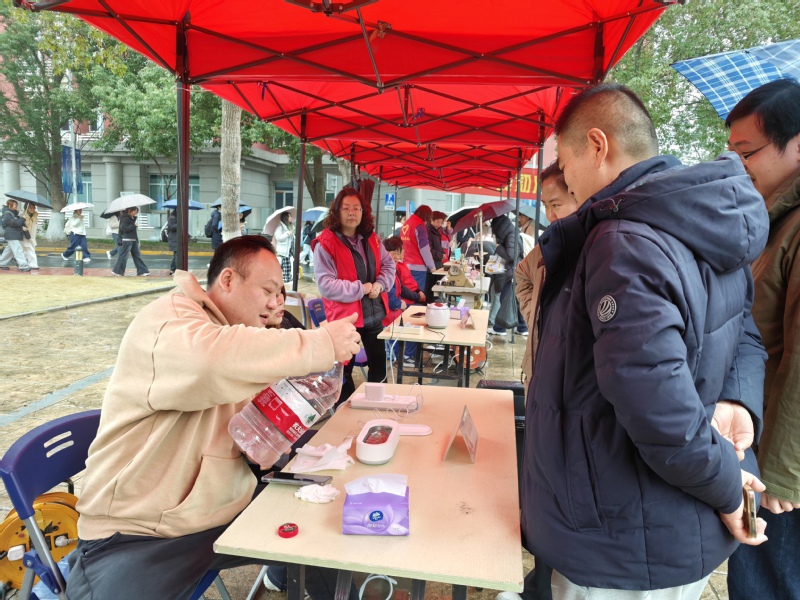 当日中午11点,尽管春雨淅沥、春寒料峭,北苑食堂广场的活动现场却暖意涌动、人气高涨。党员志愿者们提前到岗,有序搭建服务台、调试专业设备、备齐工具材料,以饱满的热情迎接每一位师生,用实际行动诠释“全心全意为人民服务”的宗旨。在健康服务专区,党员志愿者们细致为师生测量血压、血糖,同步普及日常保健、疾病预防知识,将专业的健康关怀送到师生身边;在便民修护专区,眼镜清洗、首饰保养、电脑维修、衣物缝补等服务同步开展,各个摊位前很快就排起了小队,现场气氛热烈而有序,贴心服务赢得师生连连称赞。